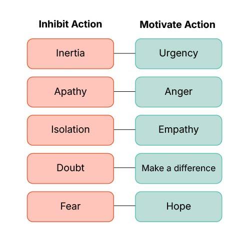 There are two broad types of emotions. Some inhibit action; such as inertia, apathy, isolation, and self-doubt. Others motivate action; including urgency, anger, empathy, a sense of agency, and hope. Our stories should centre these motivating emotions, helping people see hope over fear and neutralising emotions that prevent action.